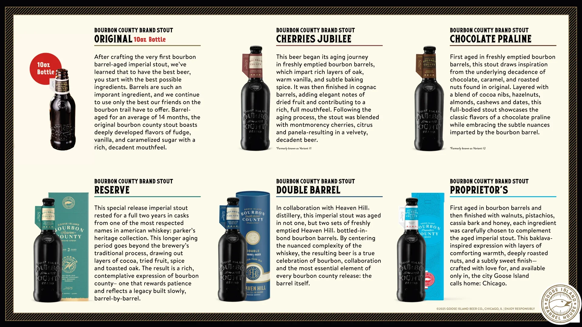 We’re thrilled to announce our pre-sale for the 2025 Goose Island Bourbon County Brand Stout lineup! This year’s collection features a full spectrum of expertly crafted stouts aged in some of the most revered bourbon barrels. Each variant celebrates the artistry, patience, and depth that define this legendary release.