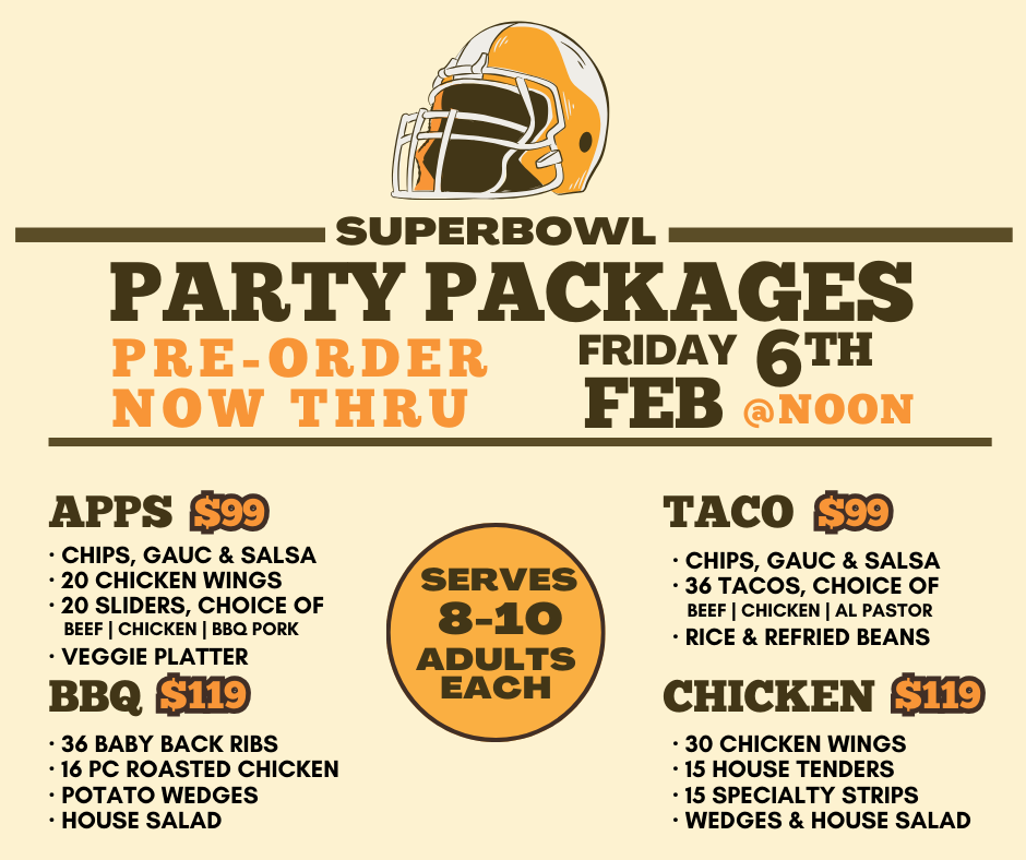 Our Super Bowl Party Packages are back and ready for kickoff. Big flavors, easy hosting, and everything you need to keep your watch party fed from kickoff to final whistle.